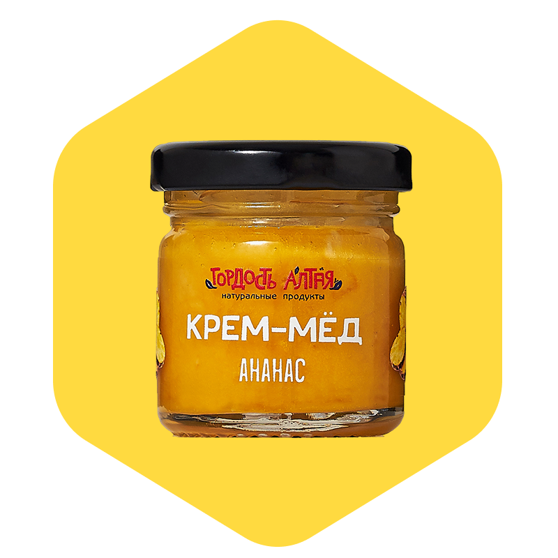 Крем-мёд с ананасом — это натуральный десерт с мягкой кремовой текстурой и тропическим фруктовым вкусом. В основе — цветочный мёд из Алтая, взбитый до пластичной консистенции. В составе используется натуральный ананас — чаще всего в виде лиофилизированного порошка или мелко нарезанных фруктовых кусочков, которые придают продукту яркий вкус, естественную сладость и легкую кислинку. Благодаря взбиванию мёд становится удобным в использовании: он не кристаллизуется, не растекается, отлично намазывается на хлеб, блинчики или используется как начинка к выпечке и как самостоятельный десерт.